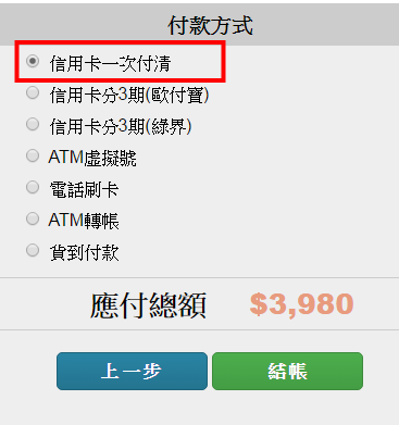 • 選擇信用卡結帳,信用卡一次付清