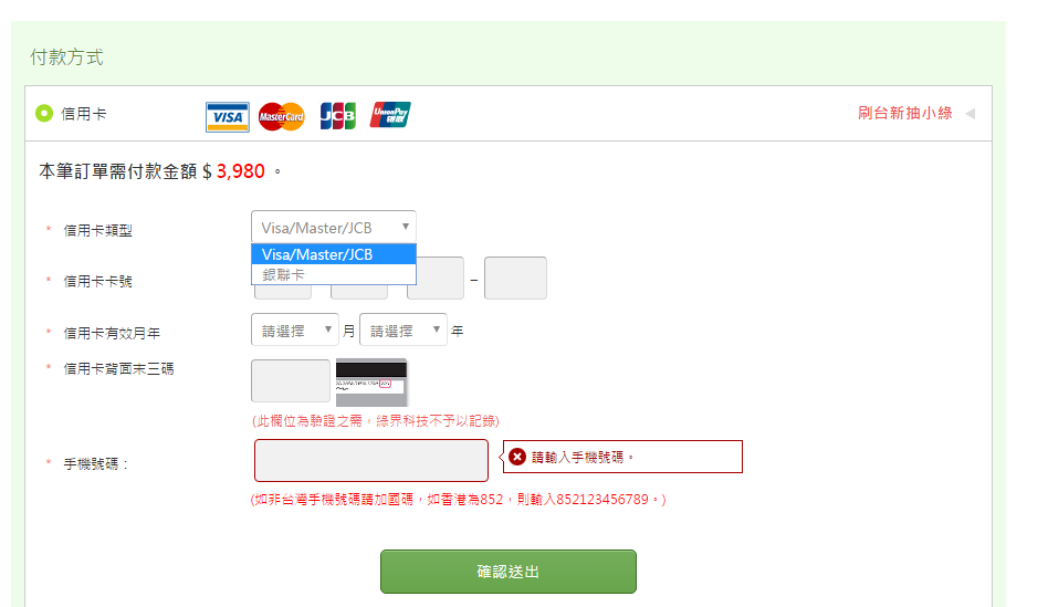 • 選擇您的信用卡類型,輸入信用卡號、有效年月、末三碼手機號碼