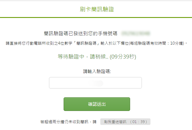 • 系統會傳送驗證碼至您的手機,收到訊後,請將驗證碼輸入